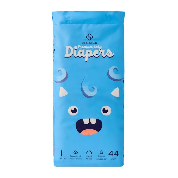 SUPERGREEN / Подгузники для детей SUPERGREEN Premium baby Diapers, размер L (9-13 кг) 44 шт.