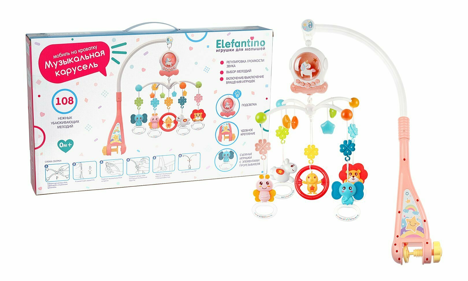 Музыкальная карусель на кроватку “Elefantino“ на бат. 108 мелодий, 5 вращ. игрушек