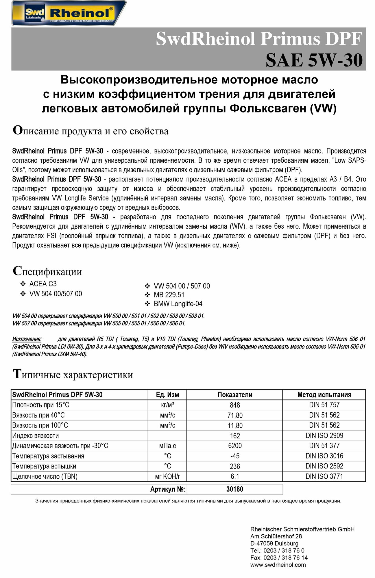 Swd Rheinol Primus Dpf 5w-30 (С3/Vw 504/507) Синт. 4л Масло Моторное SWD Rheinol арт. 30180470