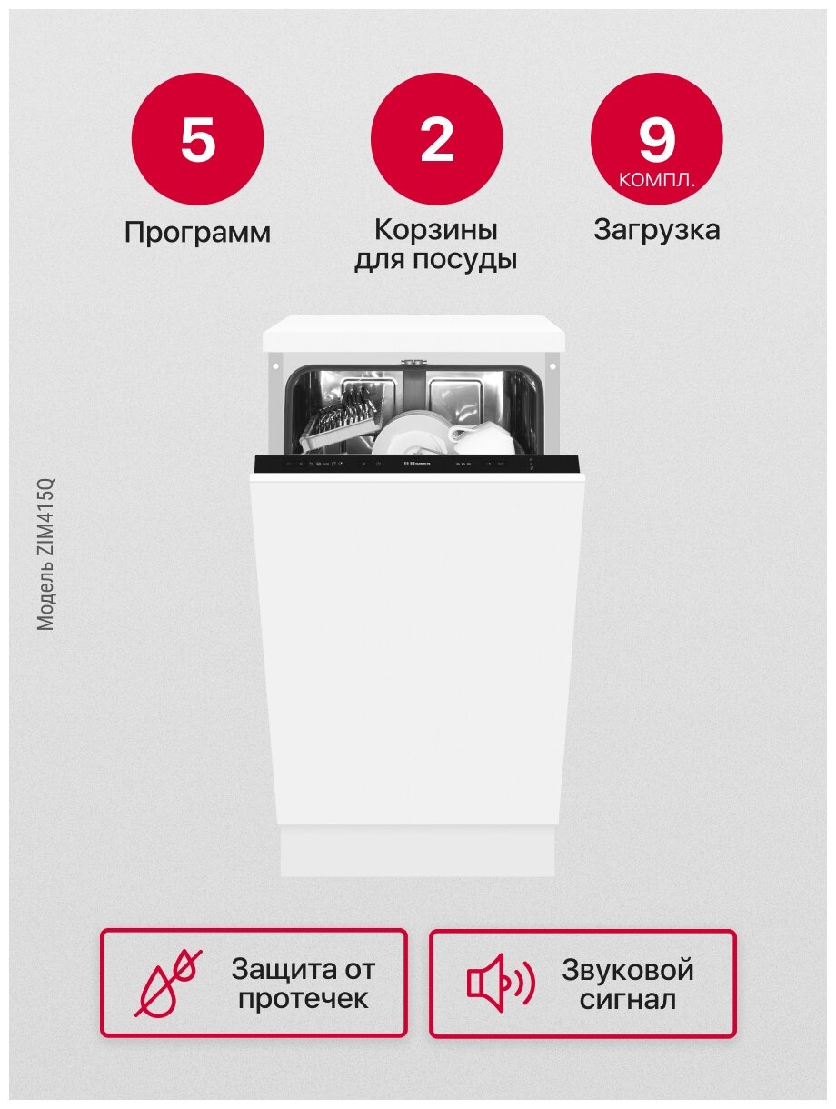 Купить Встраиваемые посудомоечные машины HANSA/ Встраиваемая посудомоечная машина ZIM415Q. Ширина - 45 см, 2 корзины. 5 программ, 9 комплектов. Механическое управление. Программа «1 час». Программа «Гигиена». Звуковая индикация. Aquastop. Автопрограмма. Программ