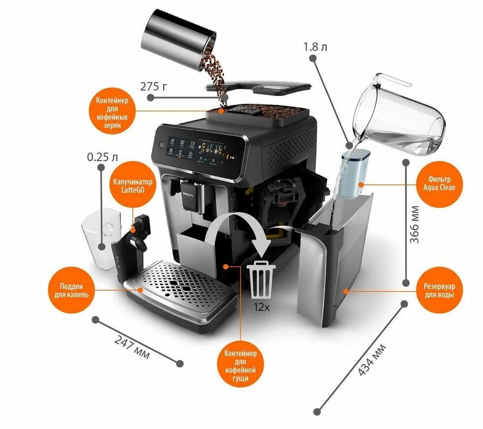 Кофемашина Philips Series 2200 EP2236 LatteGo, черный, давление 15 Бар