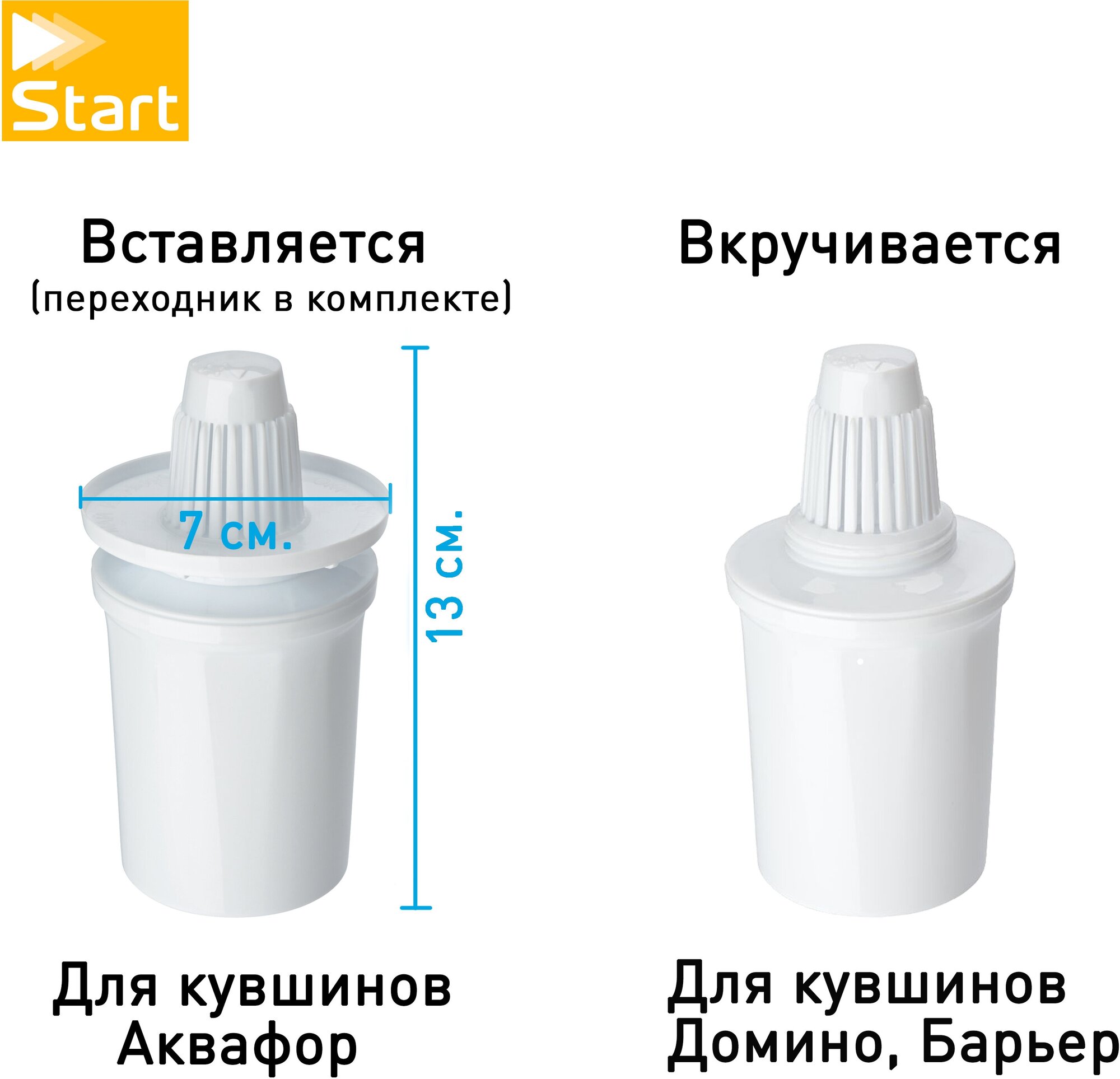Start К1105 - универсальный сменный картридж (кассета) для кувшина Домино, Барьер (резьба 4 см) или других брендов под конус (7 см с адаптером)