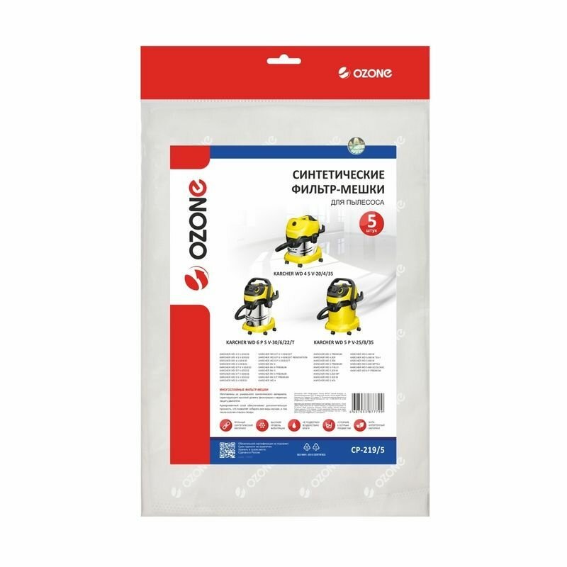 Синтетические фильтр-мешки Ozone CP-219/5 для пылесоса KARCHER MV 4, MV 5, MV 6, WD 4, WD 5, WD 6, 5 шт