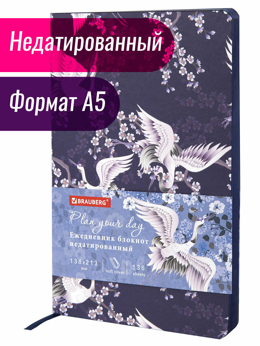 Ежедневник недатированный А5 (138х213 мм), BRAUBERG VISTA, под кожу, гибкий, 136 л., "Cranes", 112025 В комплекте: 1шт.