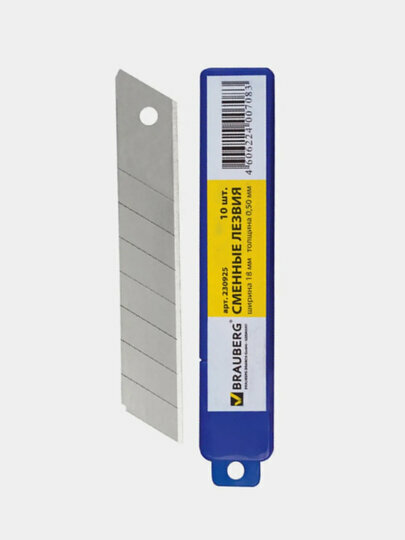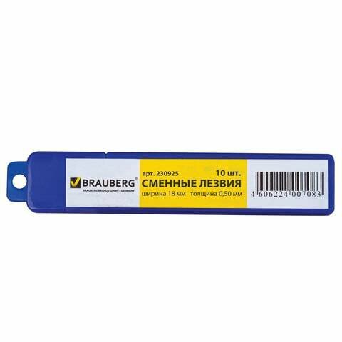 Лезвия для ножей 18 мм BRAUBERG, комплект 10 шт., толщина лезвия 0,5 мм, в пластиковом пенале, 230925 (цена за 1 ед.товара)