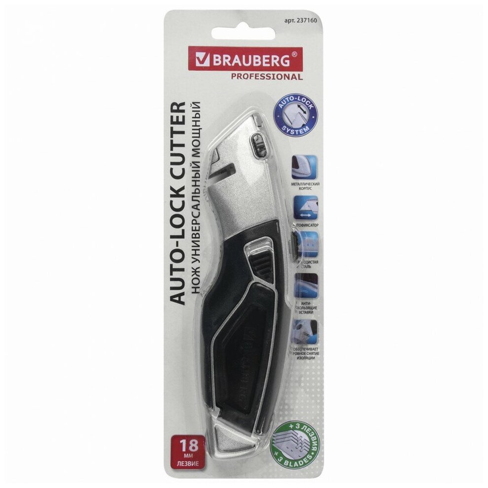 Нож универсальный мощный BRAUBERG "Professional", 4 лезвия в комплекте, автофиксатор, металл, 237160 (цена за 1 ед.товара)