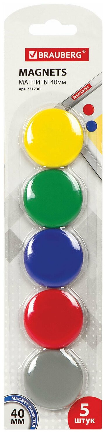 Магниты большого диаметра, 40 мм, комплект 5 штук, цвет ассорти, в блистере, BRAUBERG, 231730, - Комплект 5 шт.(компл.)