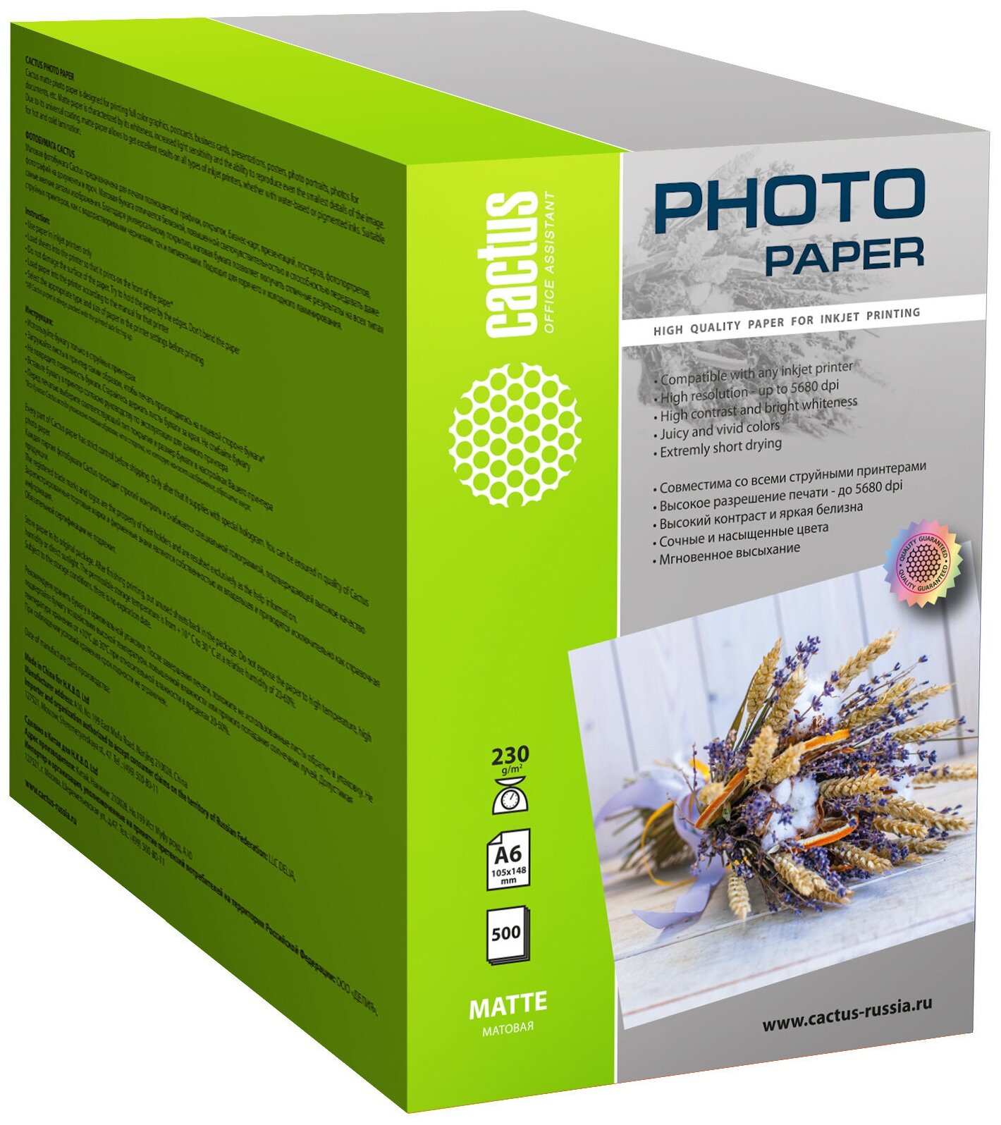 Фотобумага для струйной печати А6, 500 листов Cactus, 230 г/м2, односторонняя, матовая