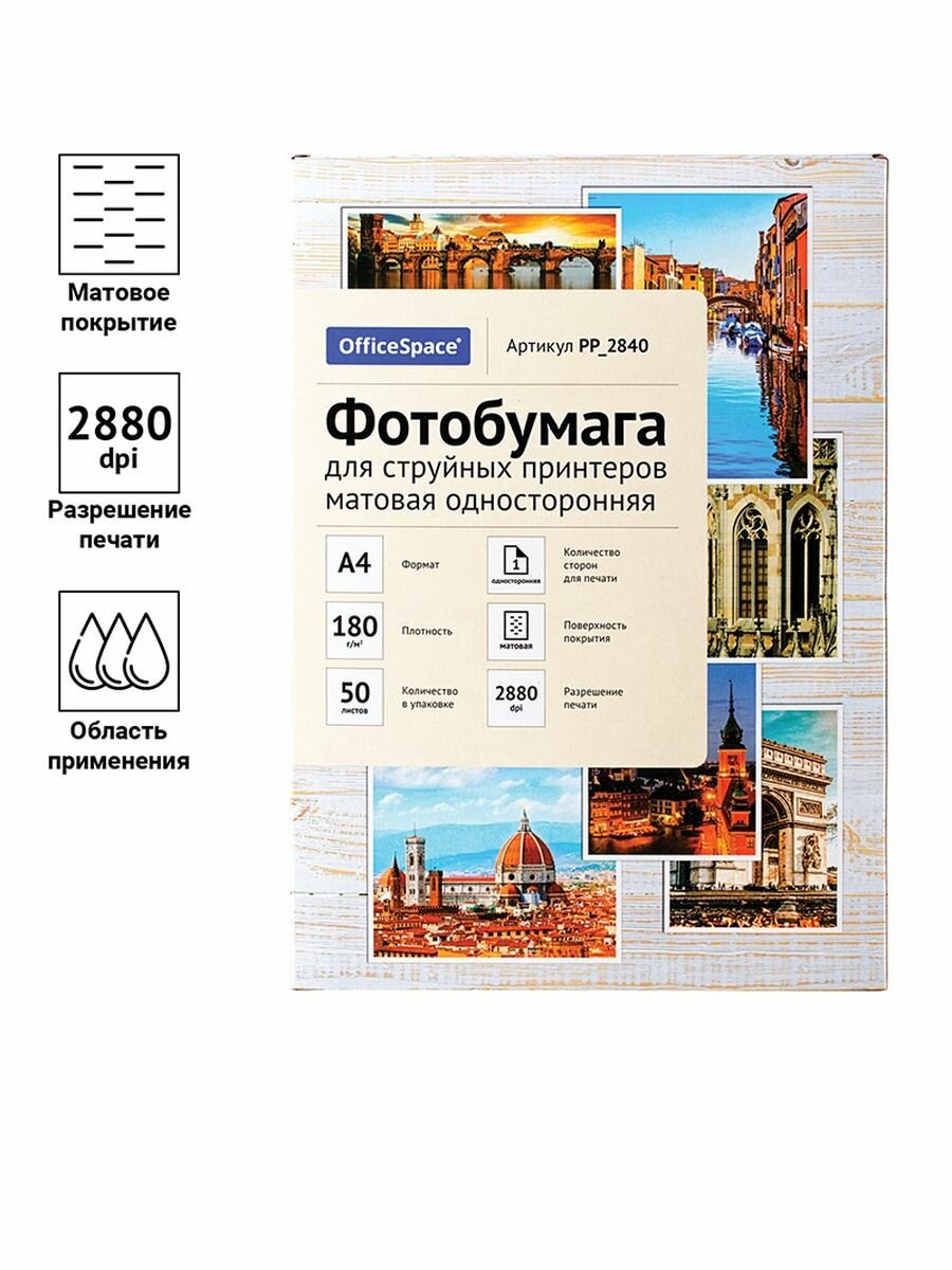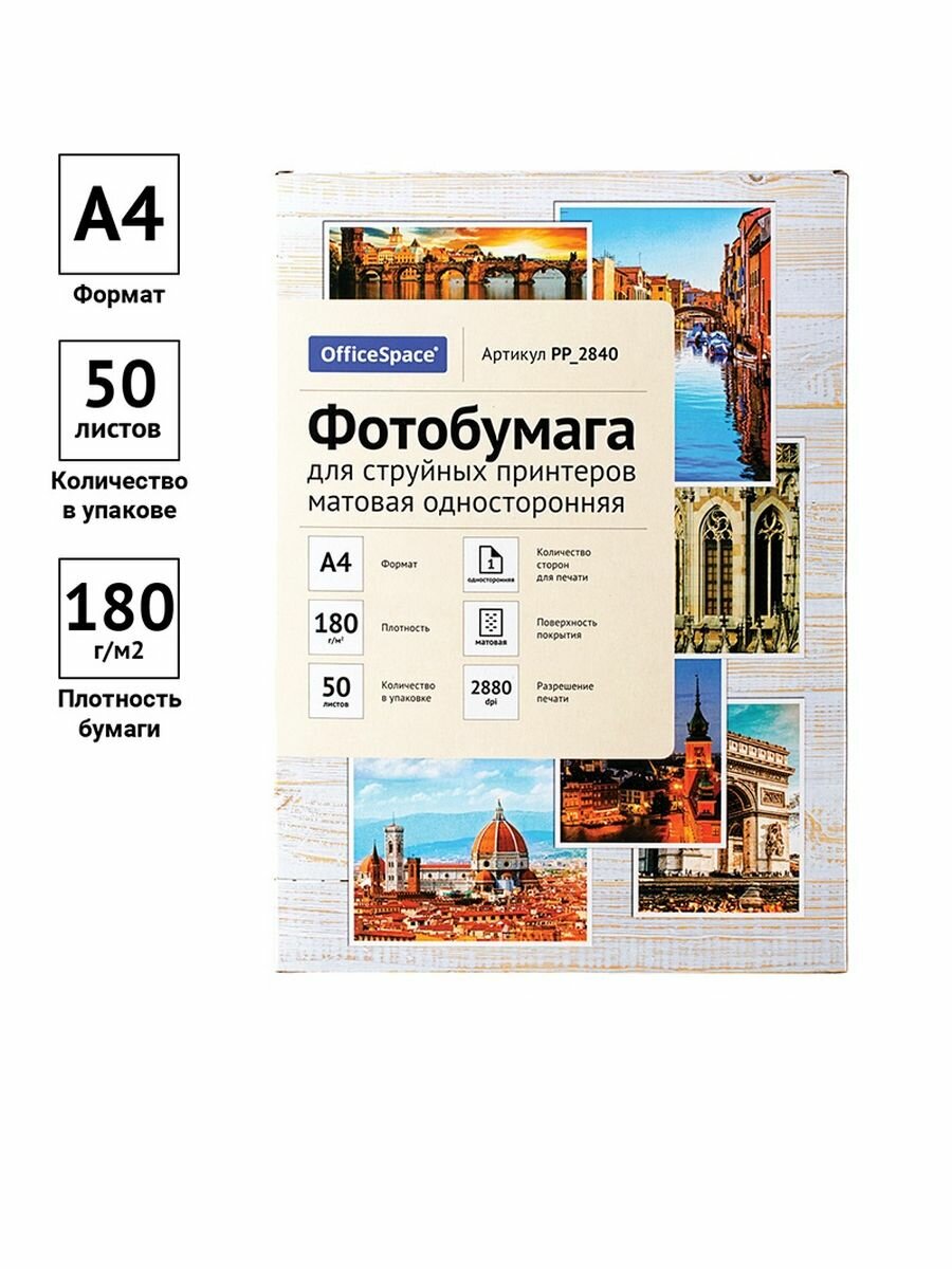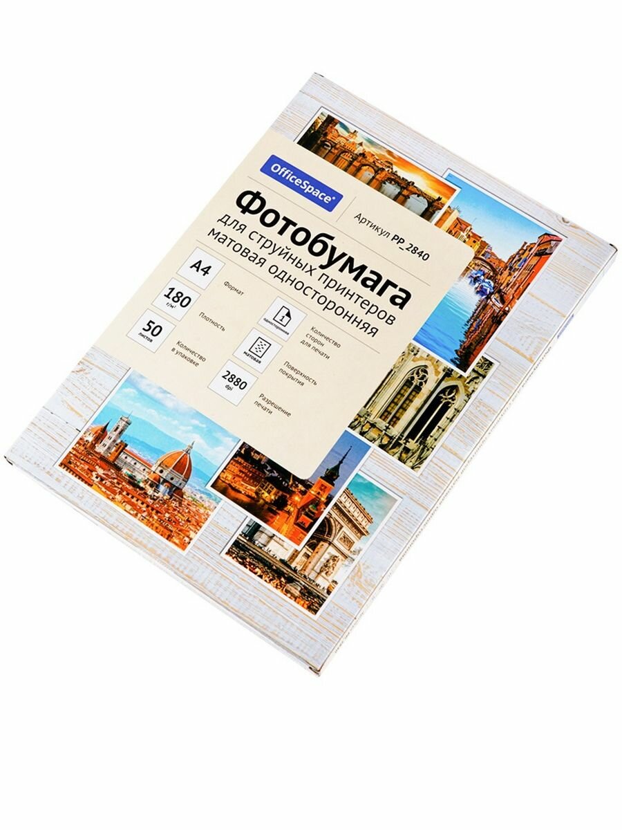 Фотобумага OfficeSpace для струйных принтеров, А4, 50 листов, матовая, односторонняя, 180 г/м2 (PP_2840)