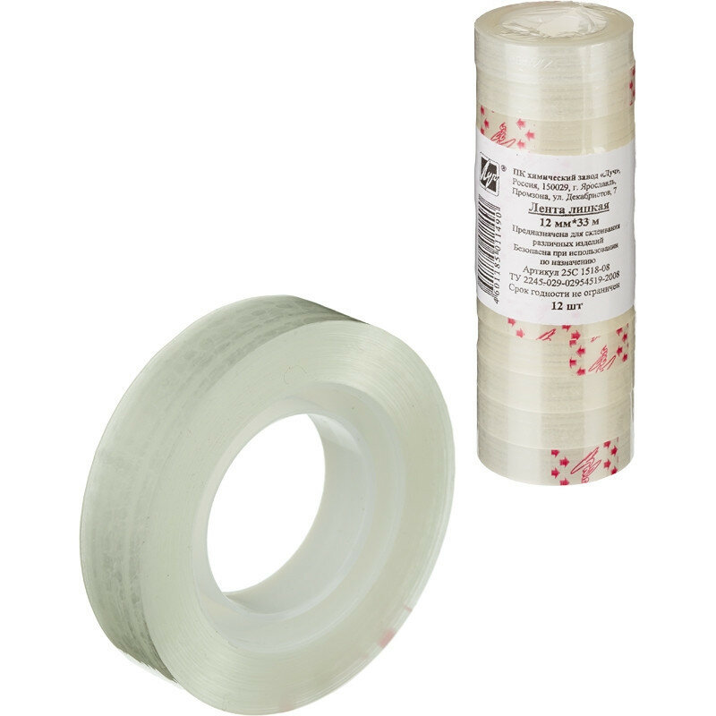 Клейкая лента (скотч) канцелярская Луч (12мм x 33м, 35мкм, прозрачная, втулка пластик) 12шт. (25С 1518-08)