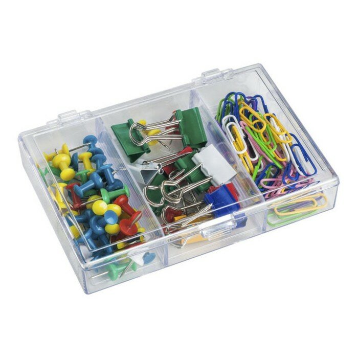 Купить Набор канцелярский из 3-х предметов (скрепки 28 мм цветные - 50 шт., зажимы для бумаг 19 мм цветные - 10 шт., кнопки силовые цветные - 40 шт.)