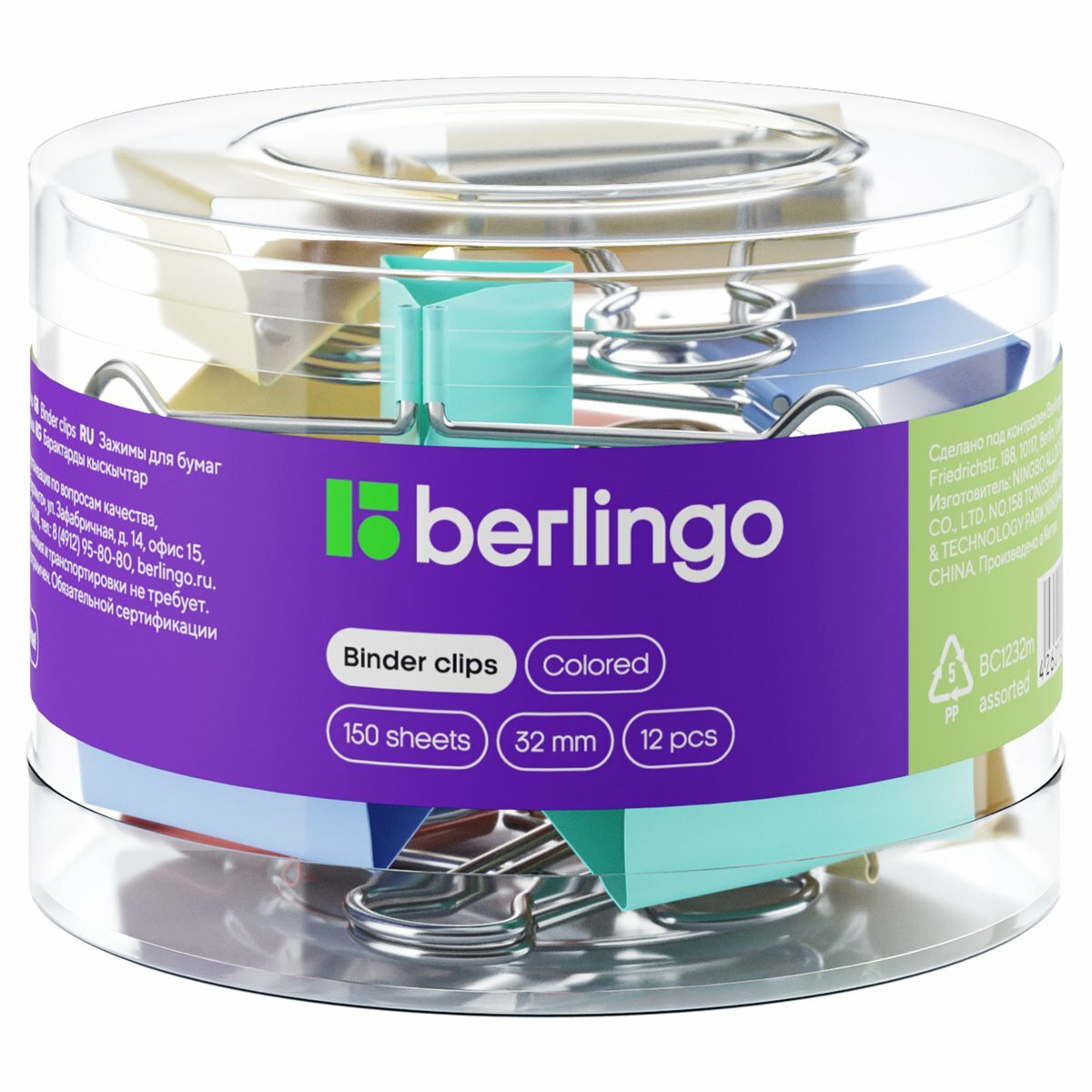 Набор зажимов для бумаг 32мм, 12 штук Berlingo, цветные, в пластиковом тубусе Berlingo 4144556 .