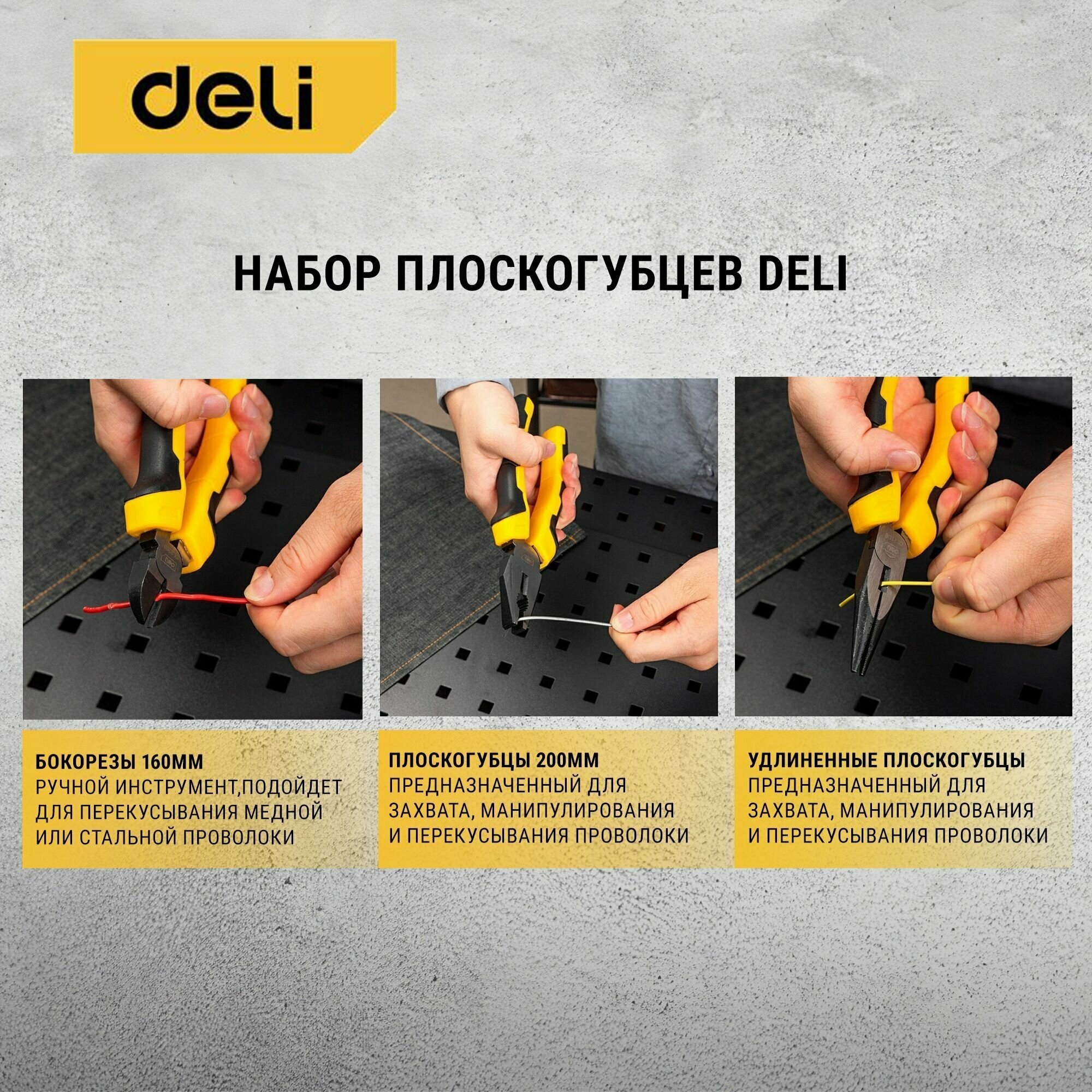Набор плоскогубцев Deli DL2008-3 (комбинированные 200мм, удлиненные 160мм, диагональные бокорезы 160мм, сталь 55C, двухкомпонентная ручка)