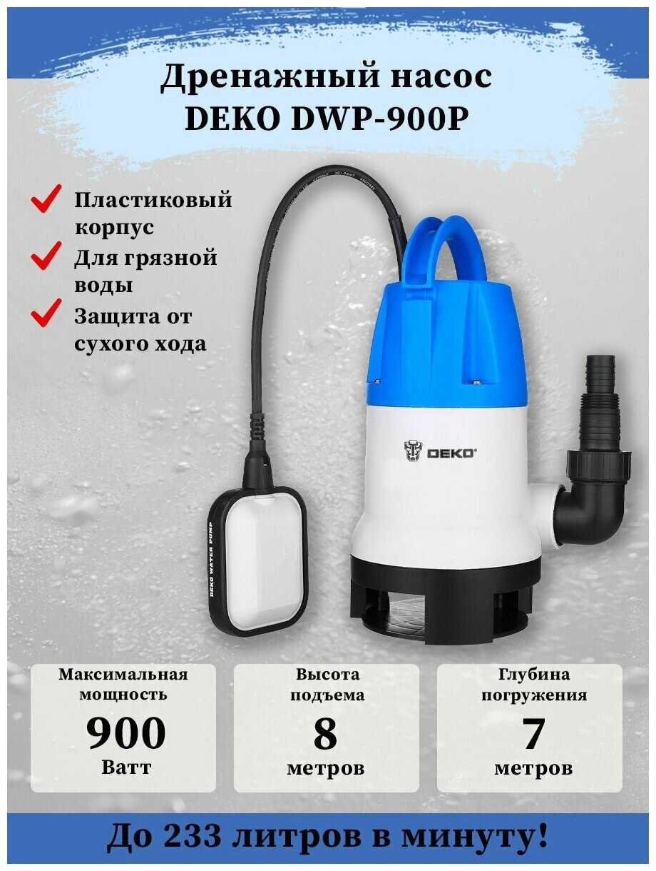 Насос дренажный Deko Dwp-900p грязевая, поплавок, 220В, 900Вт, пластик .
