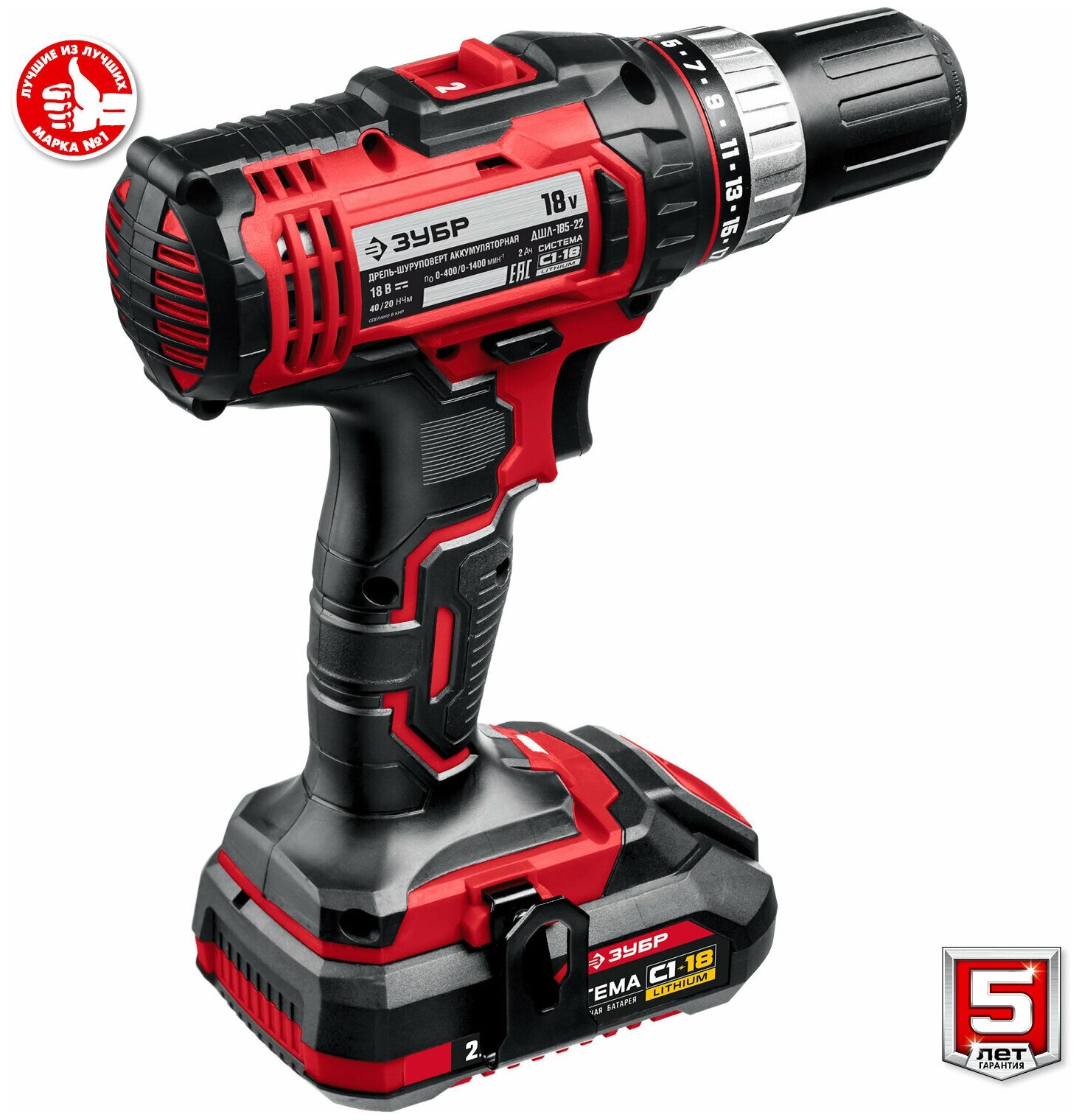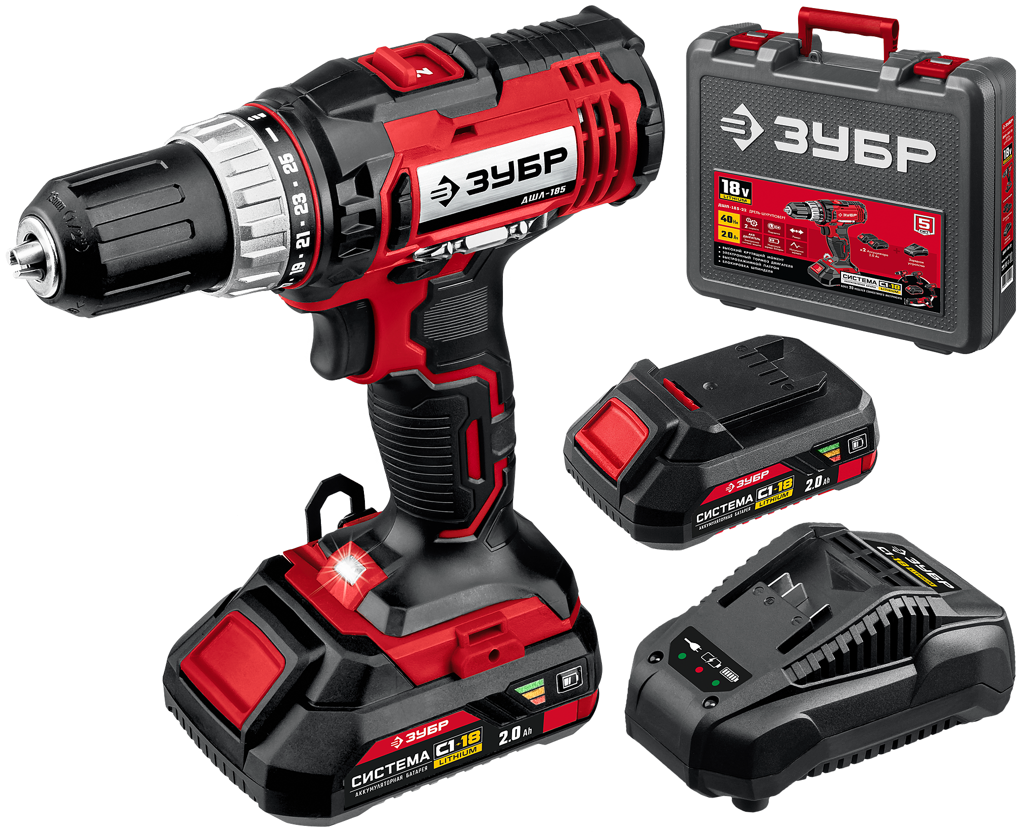 ЗУБР С1-18, 18 В, 40 Н·м, 2 АКБ (2 А·ч), дрель-шуруповерт, кейс (ДШЛ-185-22)
