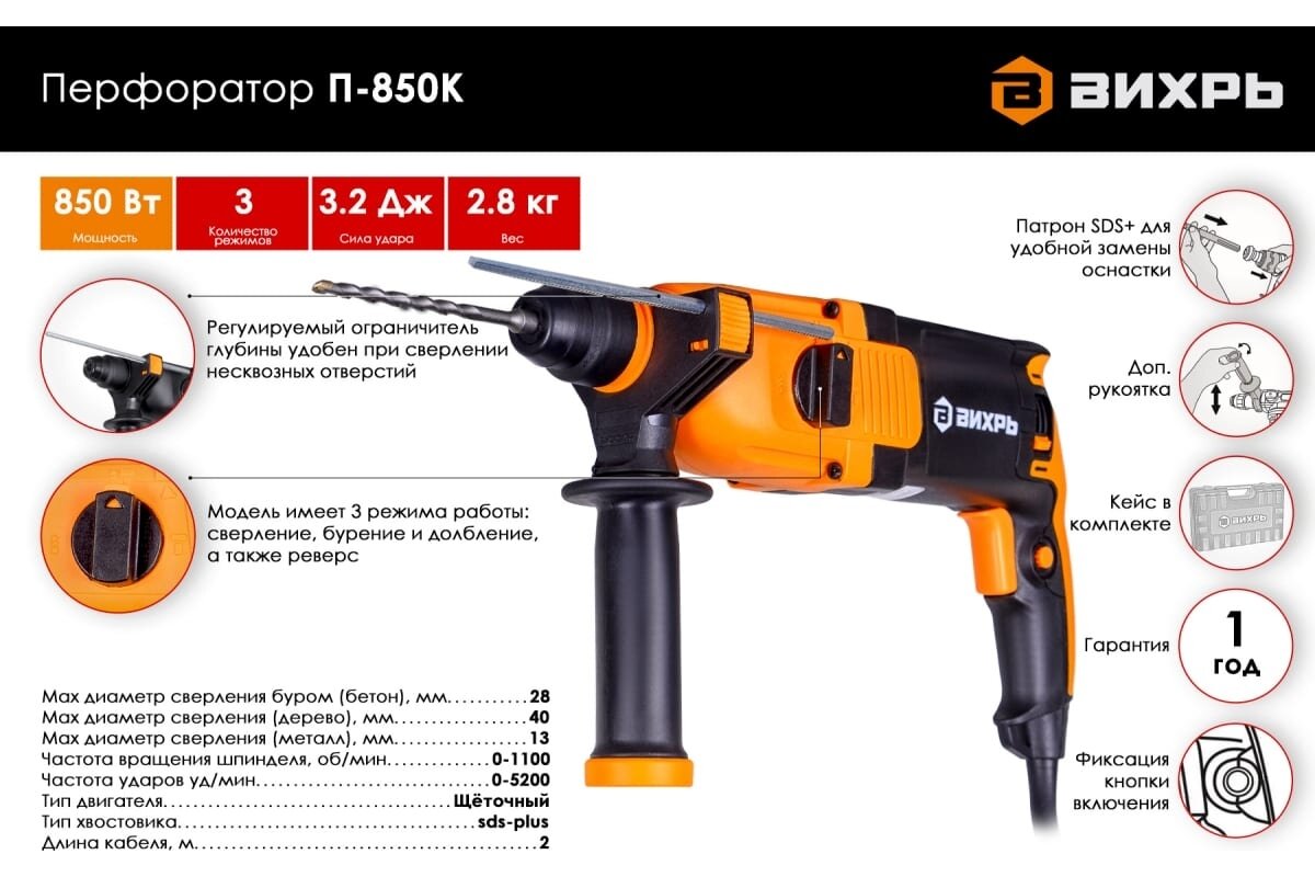 Ниже Вы можете прочитать отзывы на Перфоратор П-850К Вихрь, , шт, ознакомится с подробными характеристиками, посмотреть интересные обзоры и фотографии на Перфоратор П-850К Вихрь, , шт.