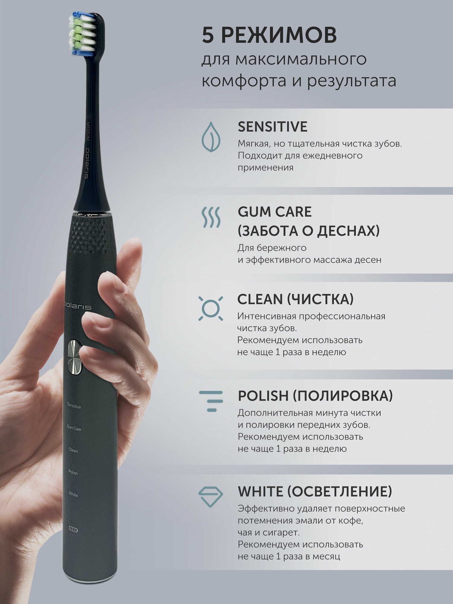 | Режимы работы | полировка / ежедневная чистка / отбеливание / массаж / деликатная чистка |