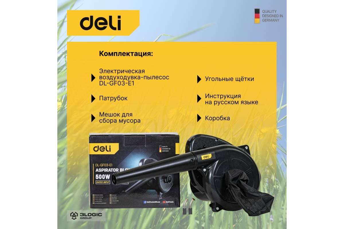 Воздуходувка-пылесос электрическая Deli DL-GF03-E1 (500Вт, 2 м3/мин, 13000 об/мин) DL-GF03-E1 .