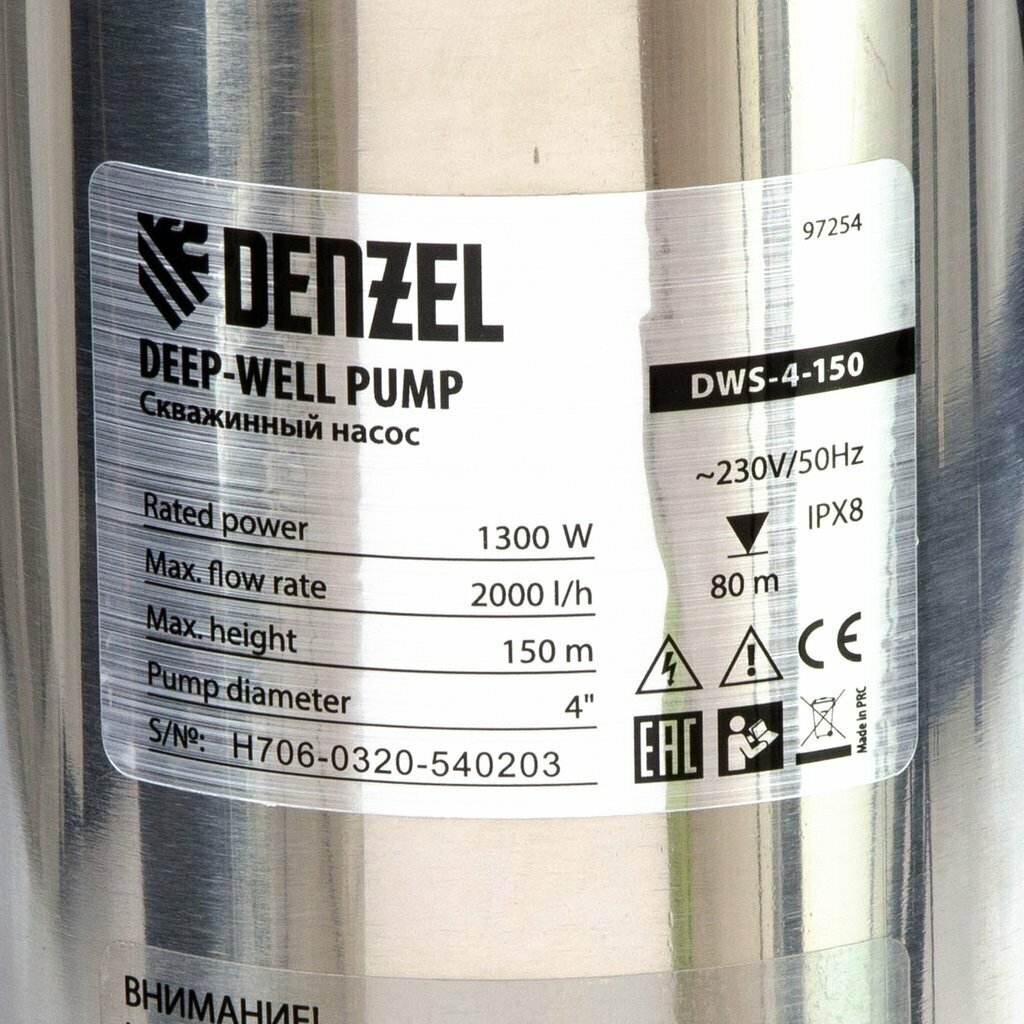denzel скважинный насос dws-4-150, винтовой, диаметр 4", 1300 вт, 2000 л/ч, напор 150 м 97254 насосы