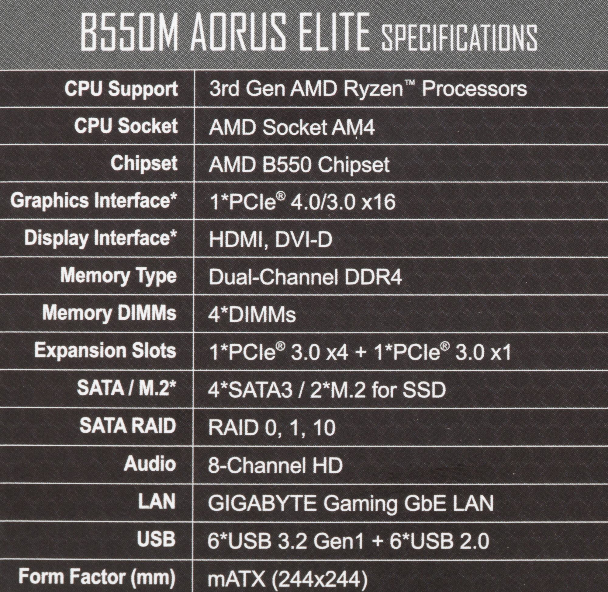 B550M AORUS ELITE, Socket AM4, AMD B550, 4xDDR4-3200, DVI-D+HDMI, 2xPCI-Ex16, 1xPCI-Ex1, 4xSATA3(RAID 0/1/10), 2xM.2, 8 Ch Audio, GLan, (4+2)xUSB2.0, (4+2)xUSB3.2, 1xPS/2, mATX, RTL {10} (809546)