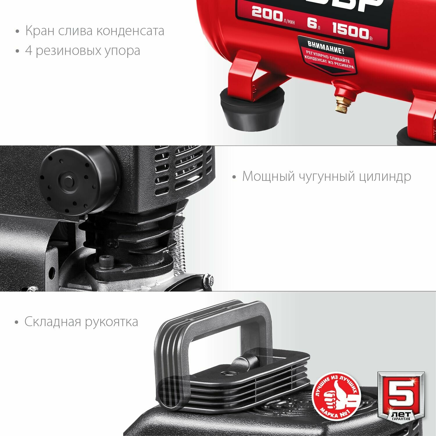 ЗУБР 200 л/мин, 6 л, 1500 Вт, 6 предметов, безмасляный компрессор (КП-200-6 Н6)