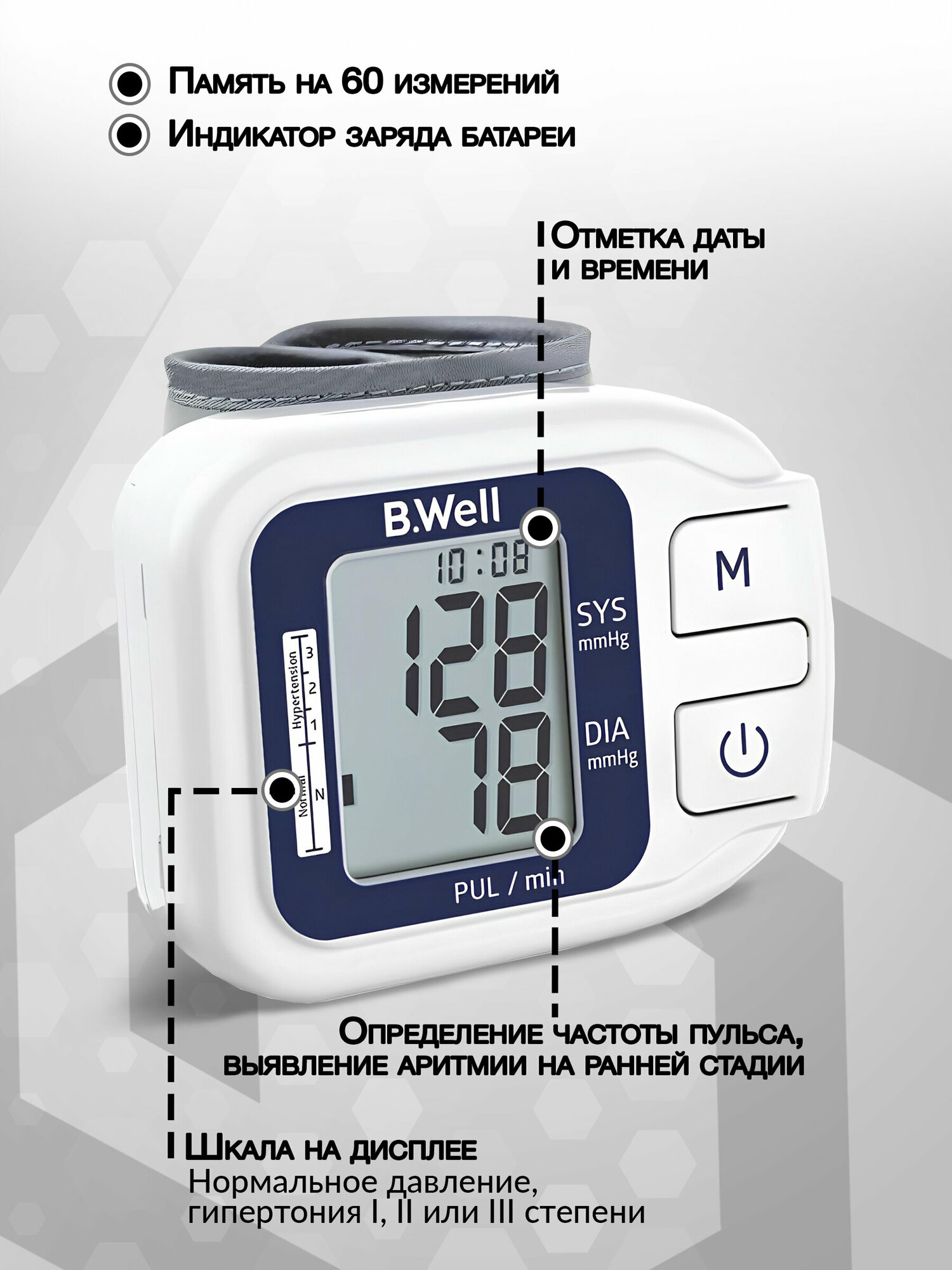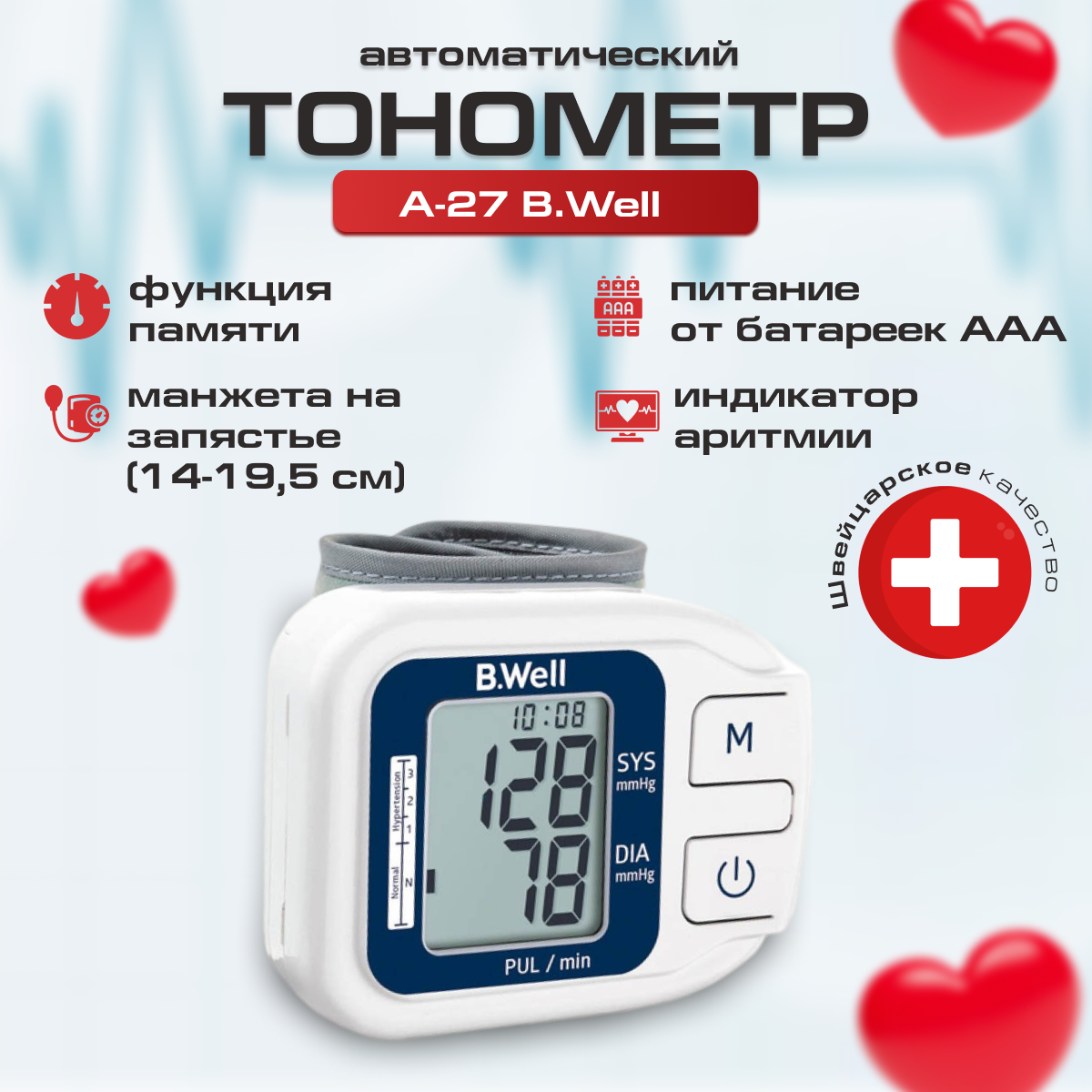 Тонометр B.Well А-27 запястный, память на 60 измерений, дата и время