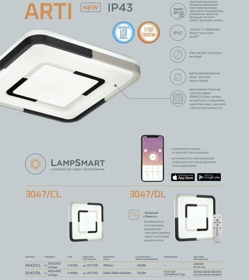 3047/DL SN 011 Светильник пластик/черный LED 48Вт 3000-6500К 430х430 IP43 пульт ДУ/ LampSmart ARTI