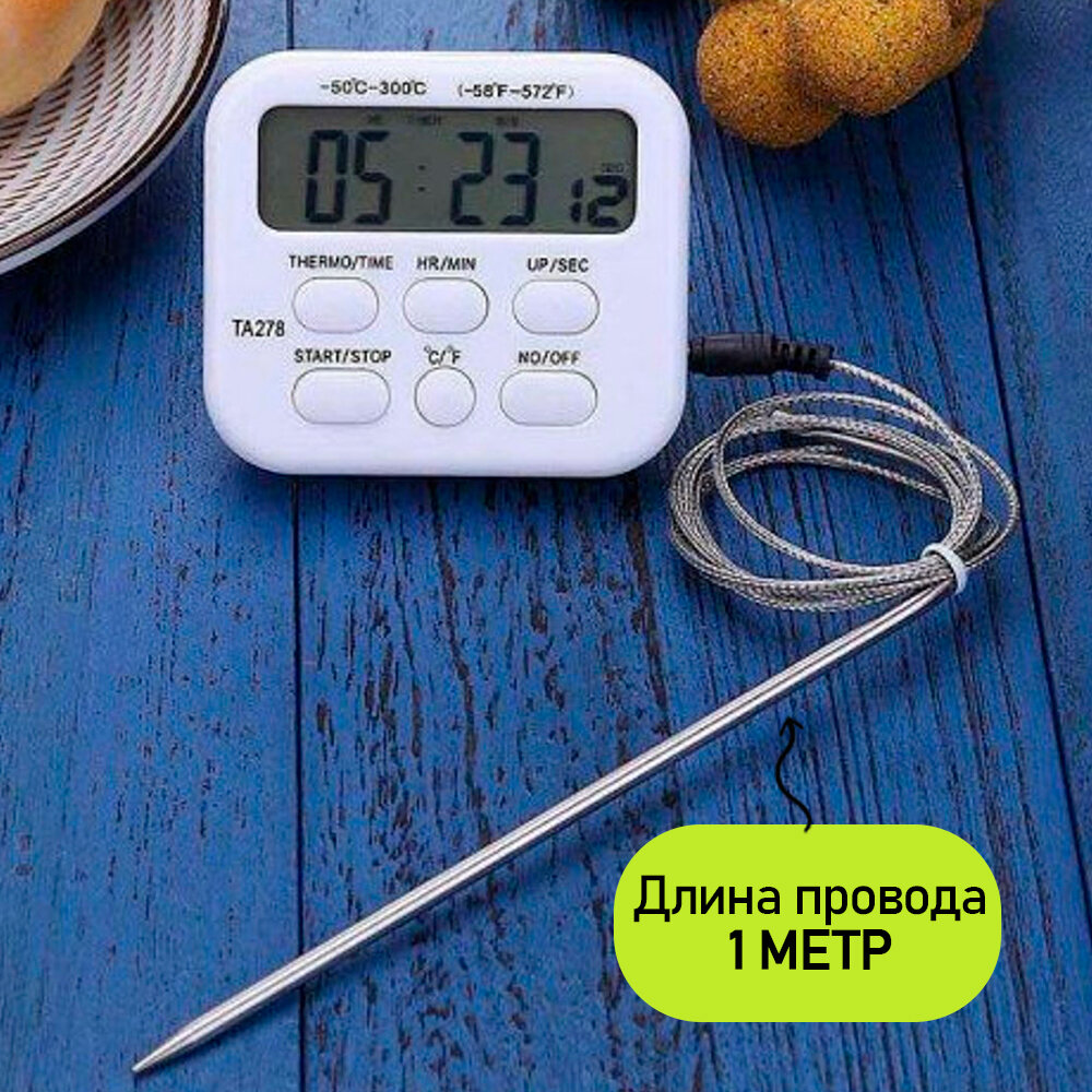 Кулинарный термометр электронный со щупом из нержавеющей стали, термометр для еды, мяса, вина, провод 1 метр / таймер кухонный