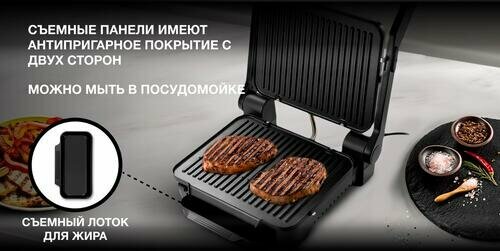 | Плюсы: | 7 программ, простое сенсорное управление, есть таймер и блокировка. Открывается легко и плотно прижимает и остается красивый рисунок на стейках. Устойчивая на столе. Лоток для стекания жира. |