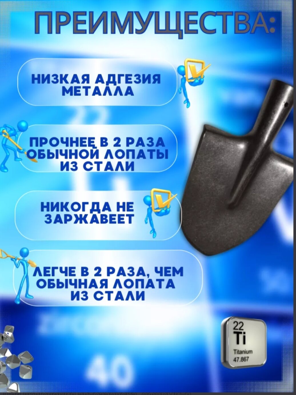 | Плюсы: | Металл толстый, легкая, как и подобает титановой лопате. |