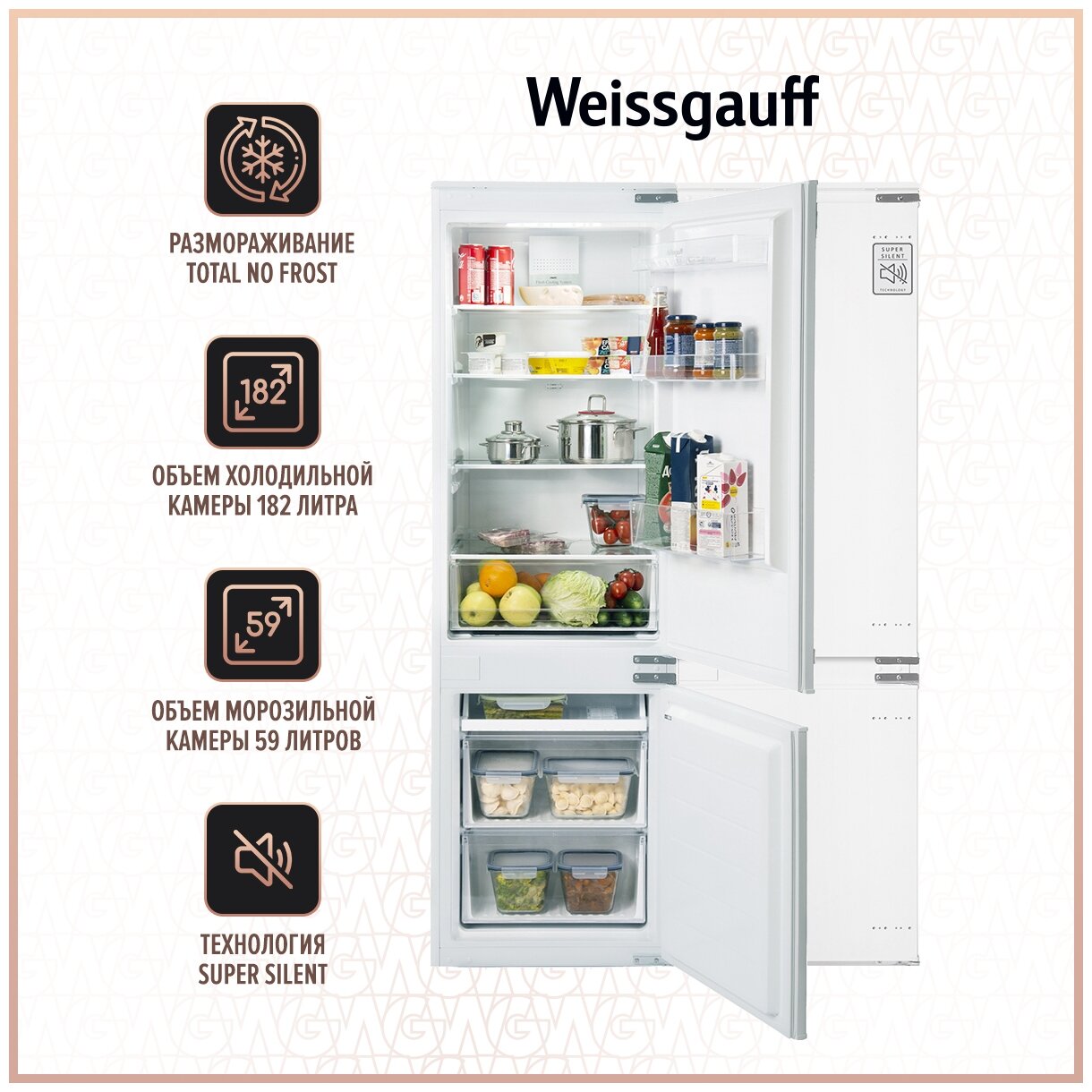 Встраиваемый холодильник Weissgauff Wrki 178 Total NoFrost двухкамерный, 3 года гарантии, объем 241 л, технология тихой работы Super Silent, электронное управление, бутылочница, LED-освещение, полки из закаленного стекла, А+