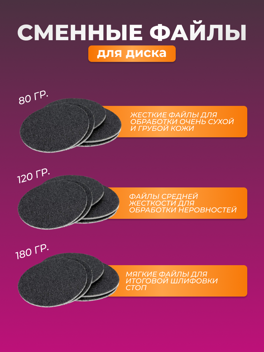 | Особенности | набор фрез в комплекте / Диск для педикюра 20 мм; 6 файлов P100 P180; 3 Спонжа 240 лезвия для педикюра |