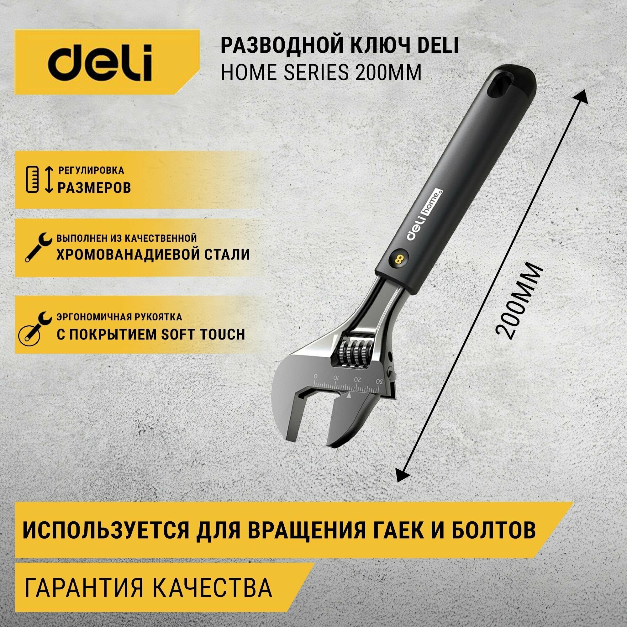 Купить Разводной ключ "Home Series" Deli HT1508 8" 200мм, Эксклюзивный дизайн, Рукоятка - высококачественный софттач пластик