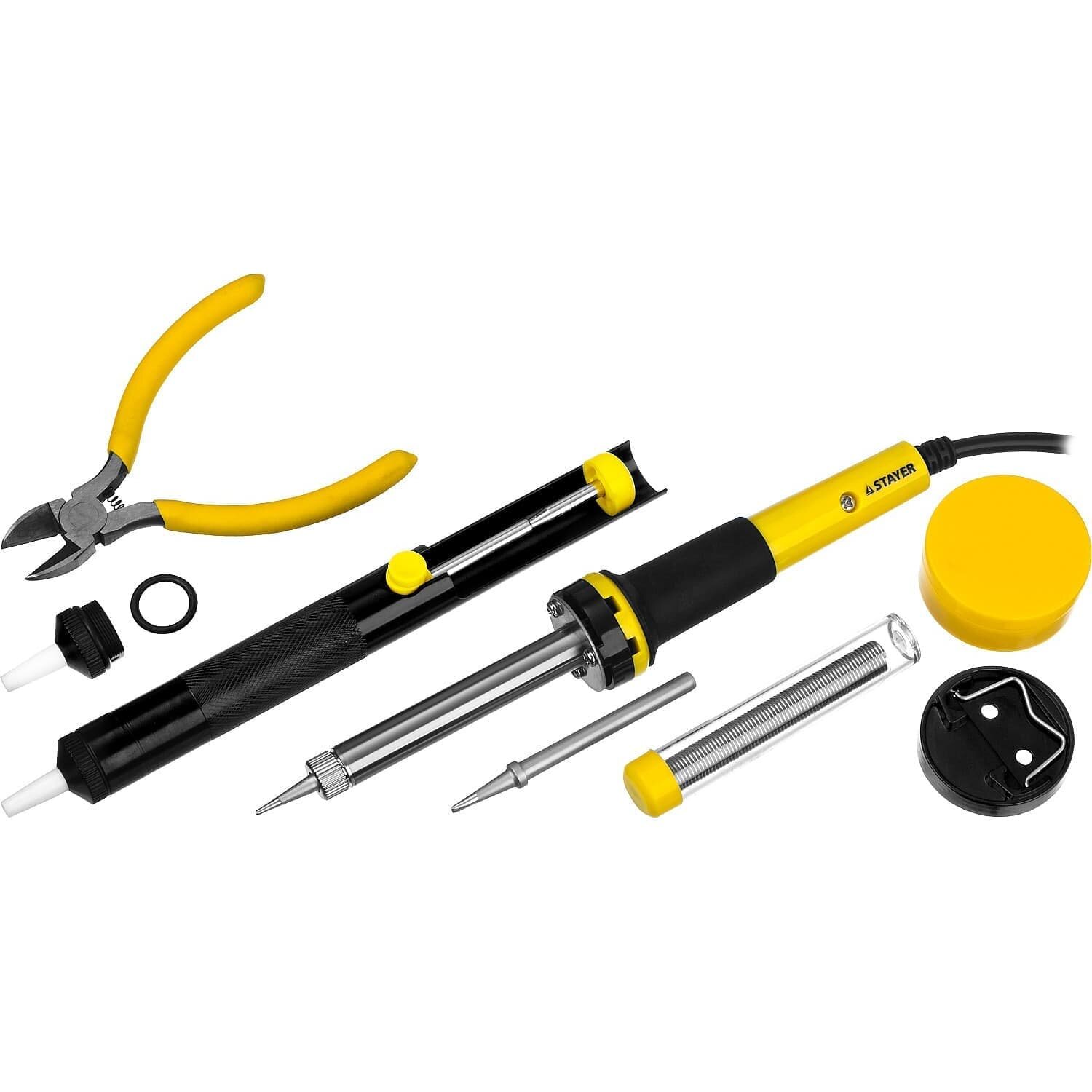 Купить Набор для паяльных работ STAYER 60Вт с 2К рукояткой, конус, подставка+припой+сменное жало+оловоотсос+сменная насадка+канифоль+кусачки, PROTerm