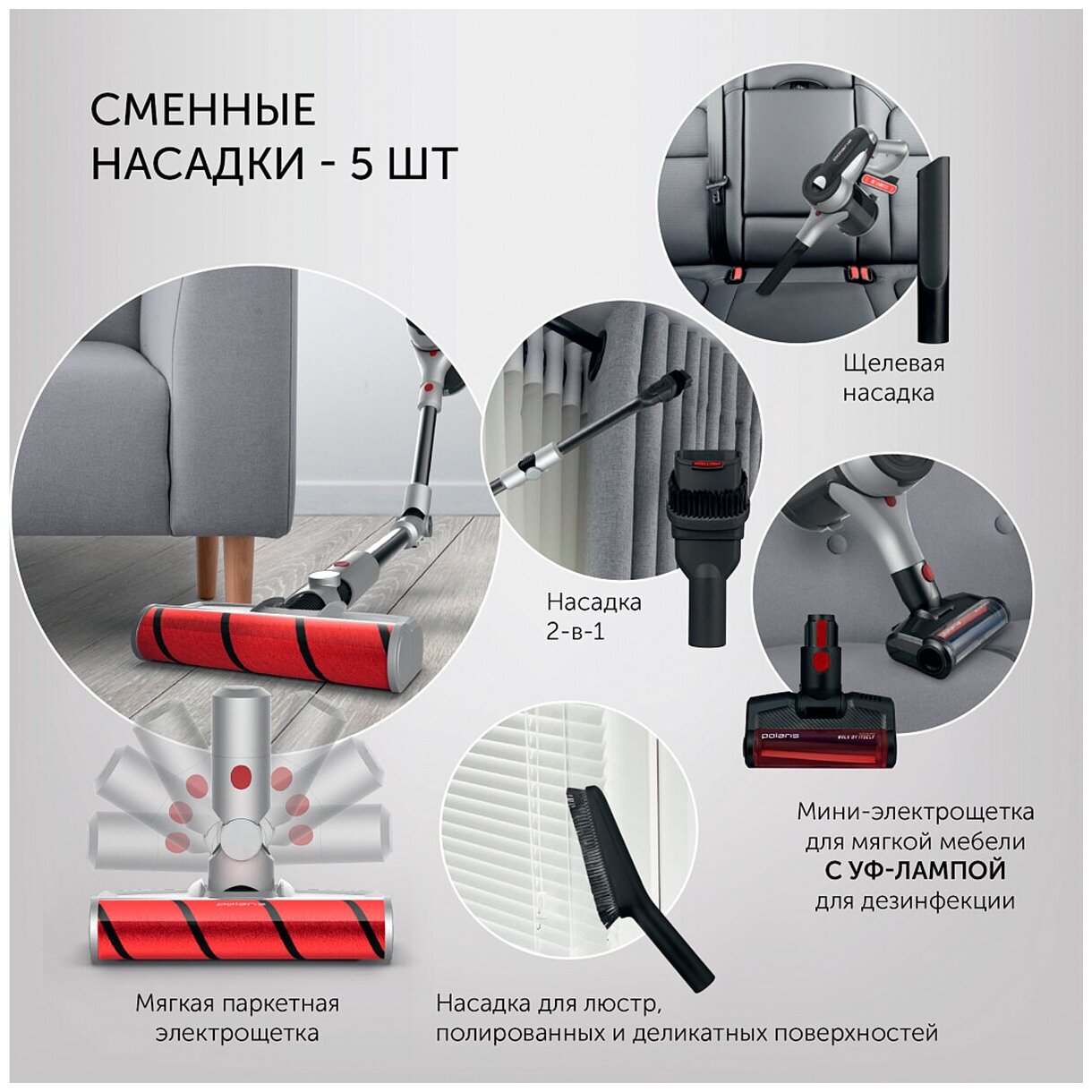 | Насадки в комплекте | мини-электрощетка для мягкой мебели с уф-лампой для дезинфекции; 2в1; щелевая; мягкая паркетная электрощетка; для люстр, полированных и деликатных поверхностей |