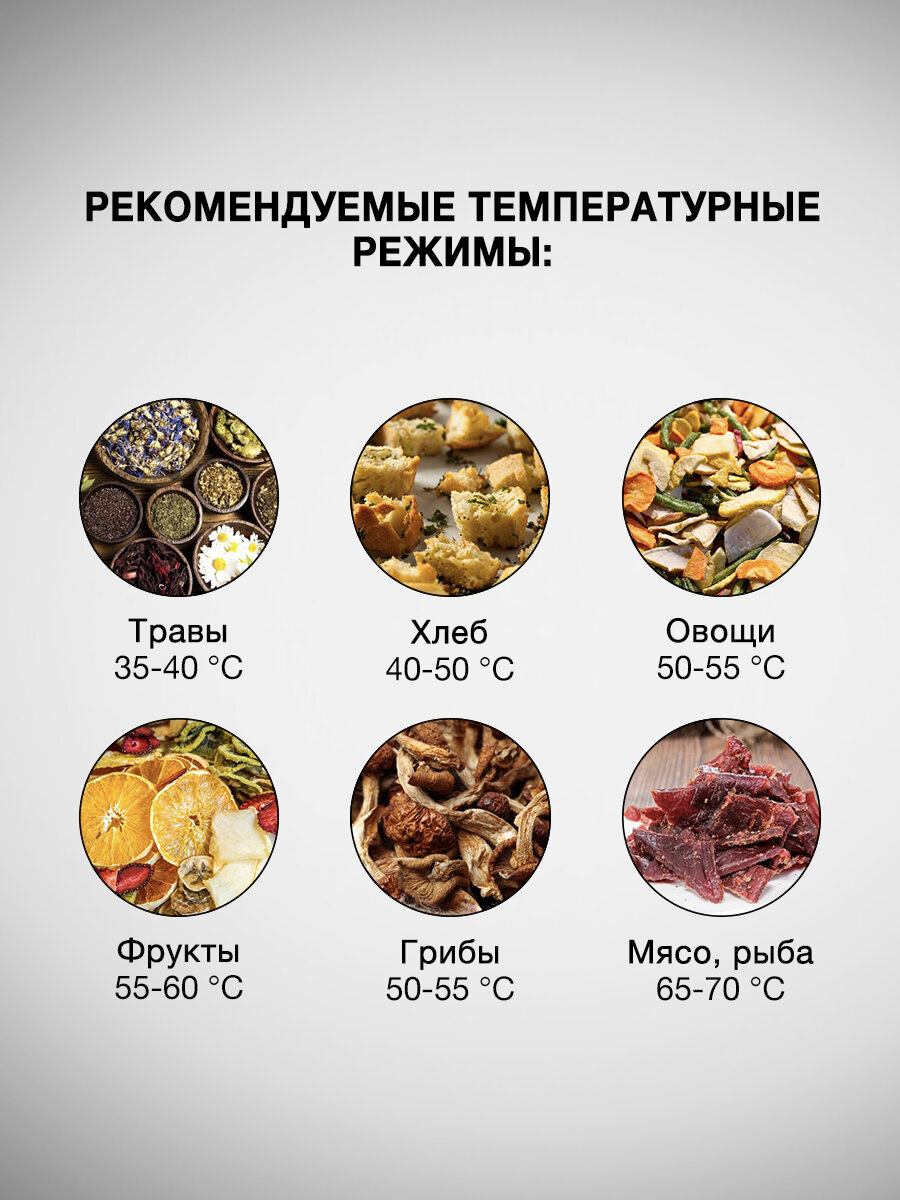 | Плюсы: | 12 поддонов в комплекте, 6 вмещает за раз, на поддон нагрузка до 3х килограмм. 500 Вт мощности с настраиваемой температурой. |