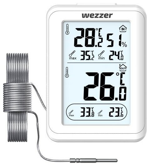 | Плюсы: | Простой удобный термометр для сауны. Возможность поставить на поверхность благодаря встроенной ножке или повесить на стену. Большой дисплей с акцентом на внешнем датчике. |