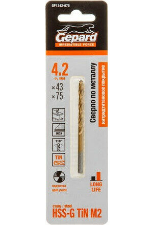 Купить Сверло по металлу спиральное 4,2х43х75 мм GEPARD HSS TIN (GP1342-075)