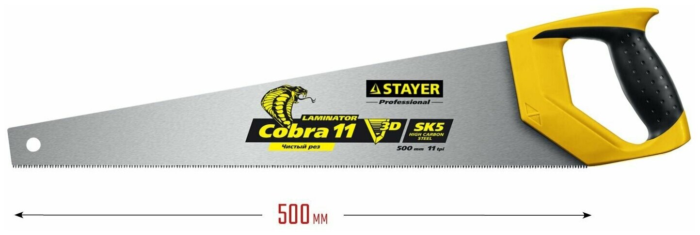 Ножовка многоцелевая (пила) COBRA Laminator 500мм, 11TPI, 3D высокоточный рез , STAYER (1516-50)