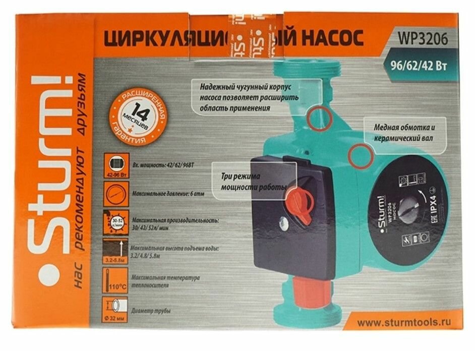 WP3206 насос циркуляционный STURM, 3 скорости, макс 96Вт интересное: