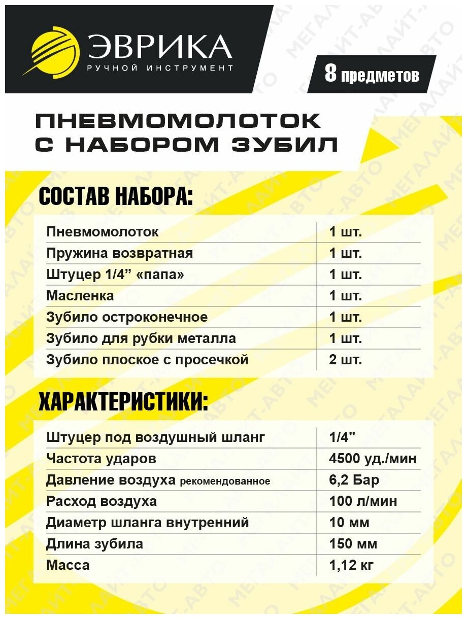 Пневмомолоток эврика 4500 уд/мин 150мм 9 предметов интересное: