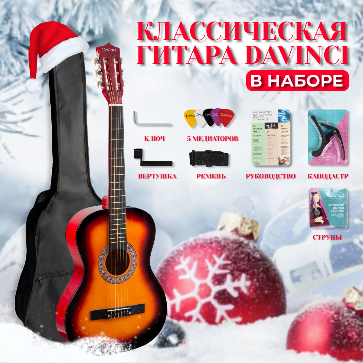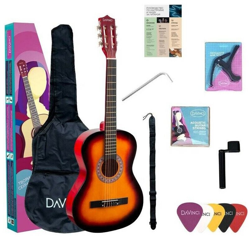 DAVINCI DC-50A SB PACK- набор гитариста: классика 7/8, чехол, медиатор, ремень, каподастр, вертушка, струны интересное: