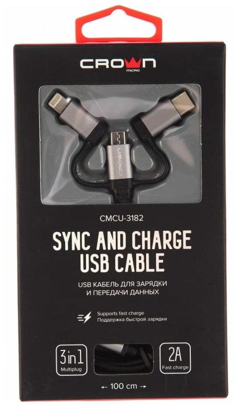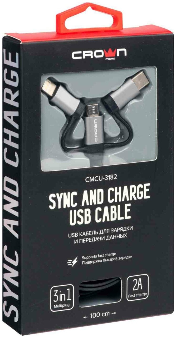 Кабель Crown USB - microUSB/USB Type-C/Lightning CMCU-3182 black (100 см)
