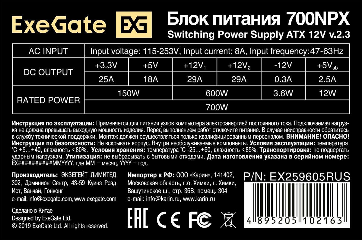 Купить Блок питания 700W Exegate 700NPX, Atx, black, EX259605RUS .