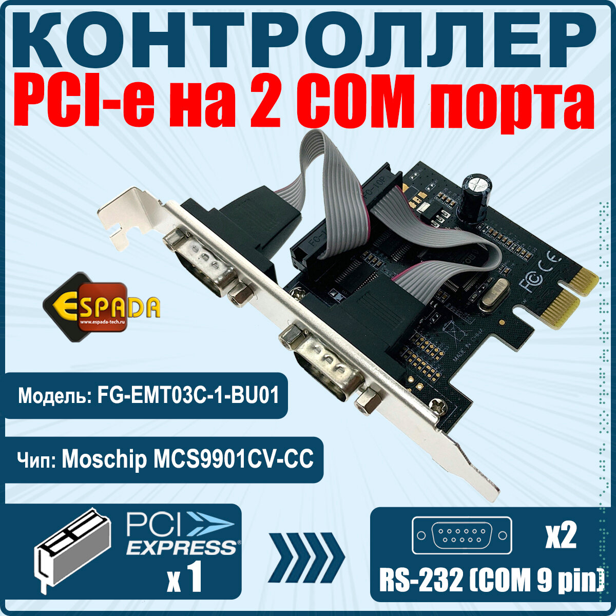 Контроллер Espada, PCI-E to 2 RS232 порт, чип MCS9901, FG-EMT03C-1-BU01