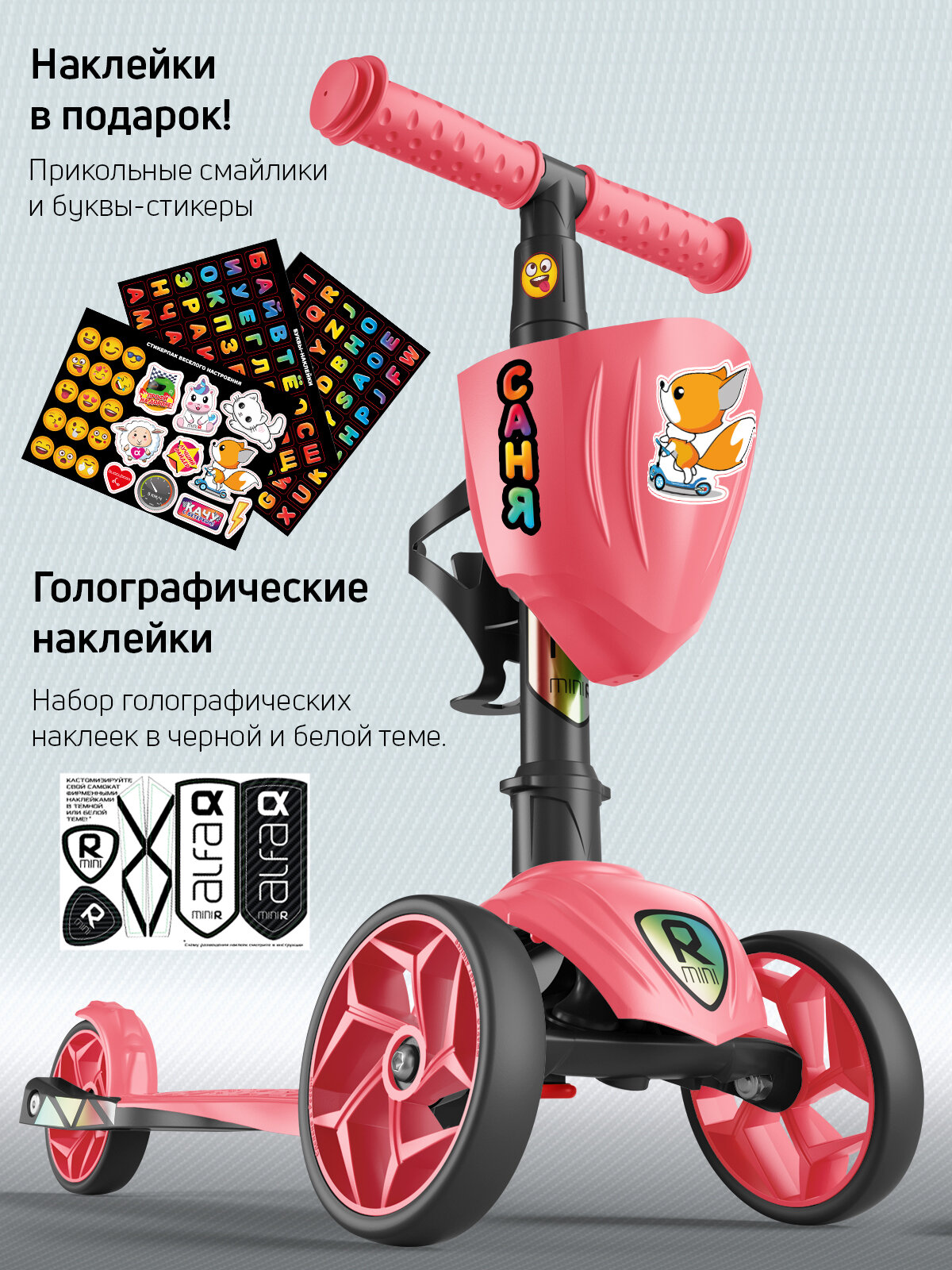 Самокат детский трехколесный с корзинкой, подстаканником для бутылок и наклейками
