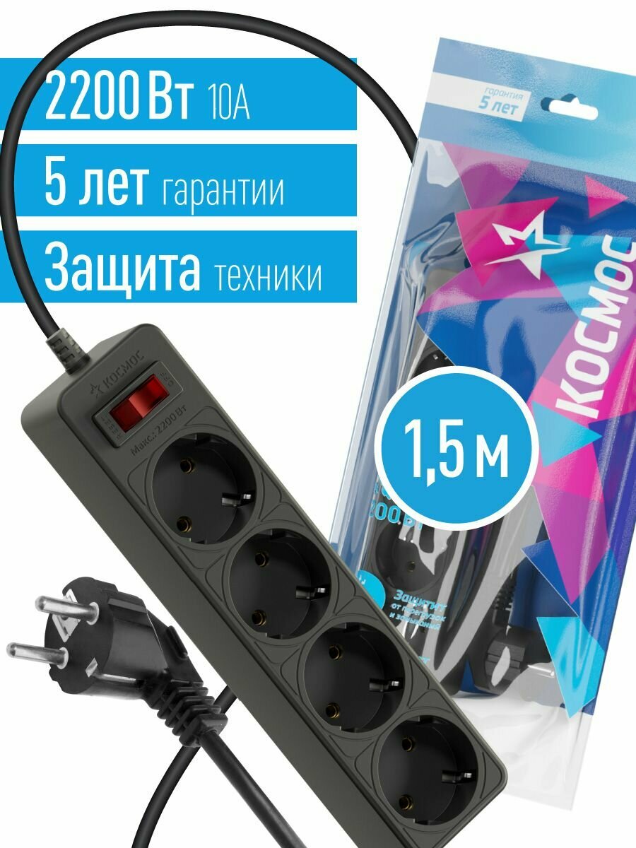 Сетевой фильтр космос, 1.5м, 4 гнезда с заземлением, с предохранителем, 10А/2.2 Квт, серый