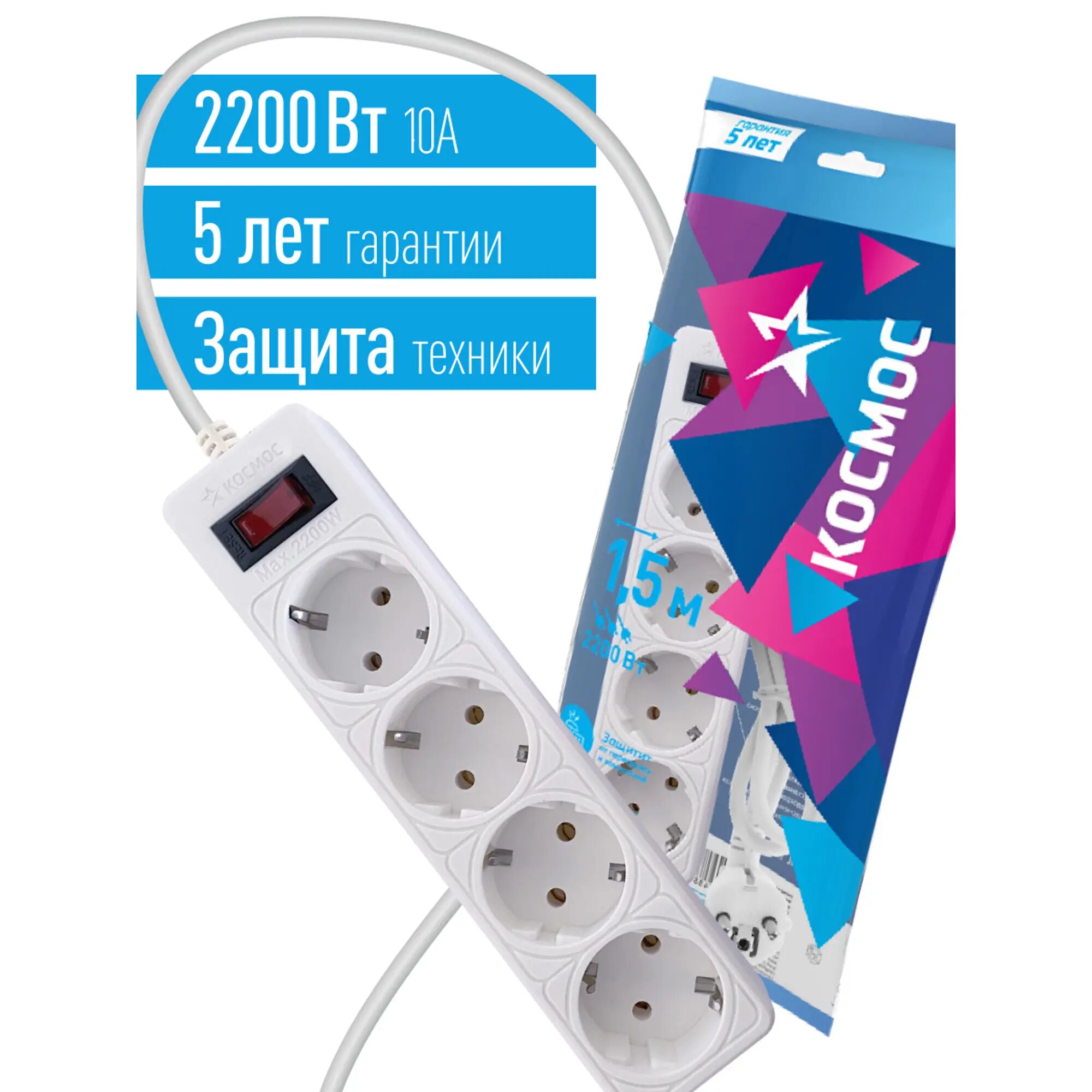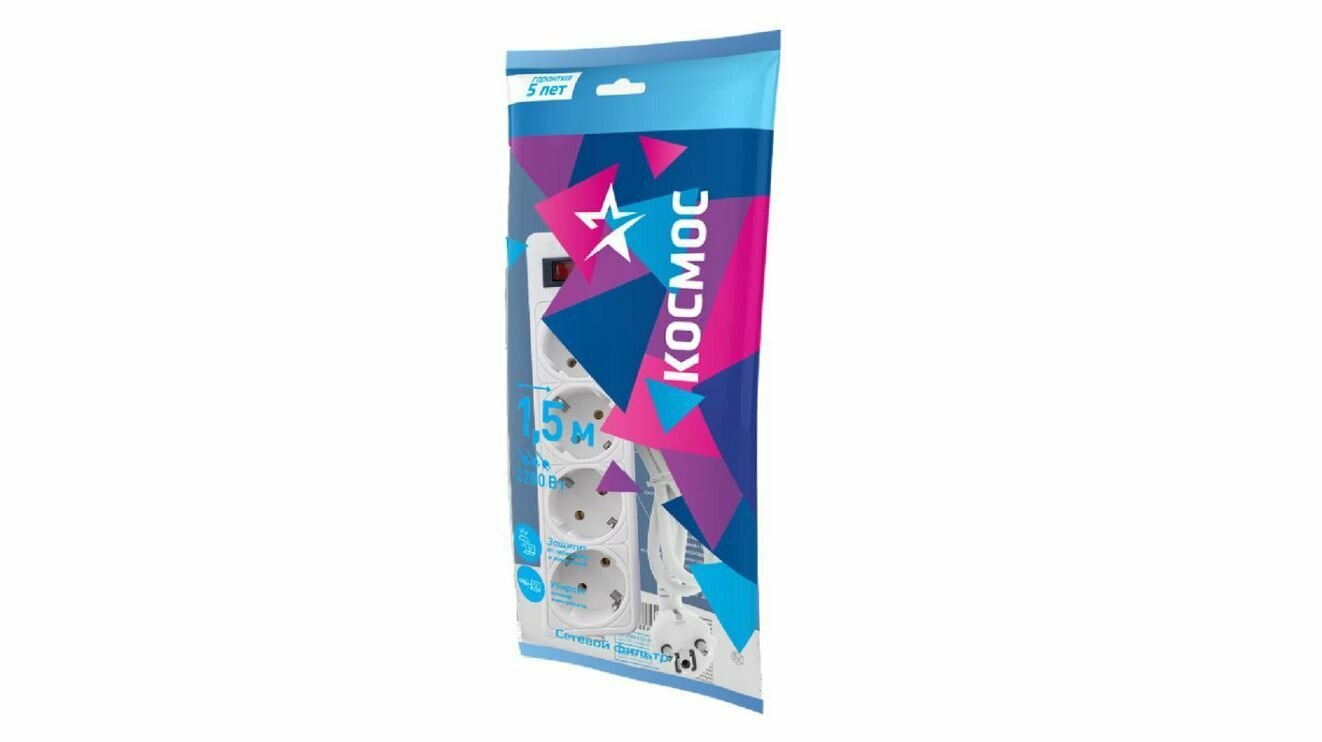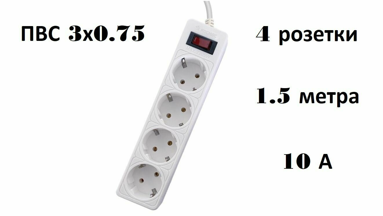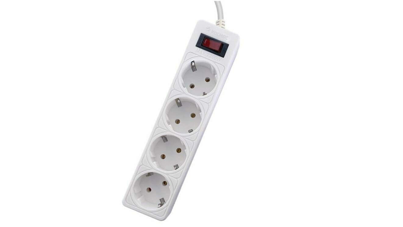 Сетевой фильтр космос 1,5м 4 гнезда, пвс 3х0,75мм2, 10А/2,2кВт белый