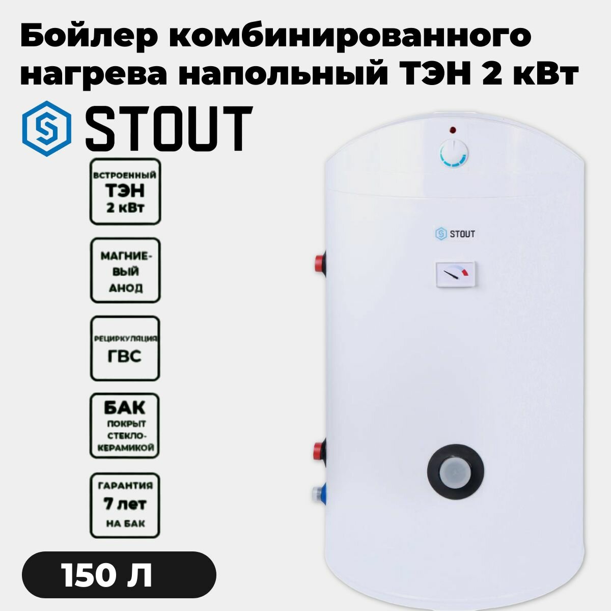 Водонагреватель комбинированного нагрева 150 л, ТЭН 2 кВт, напольный STOUT (SWH-1110-050150)