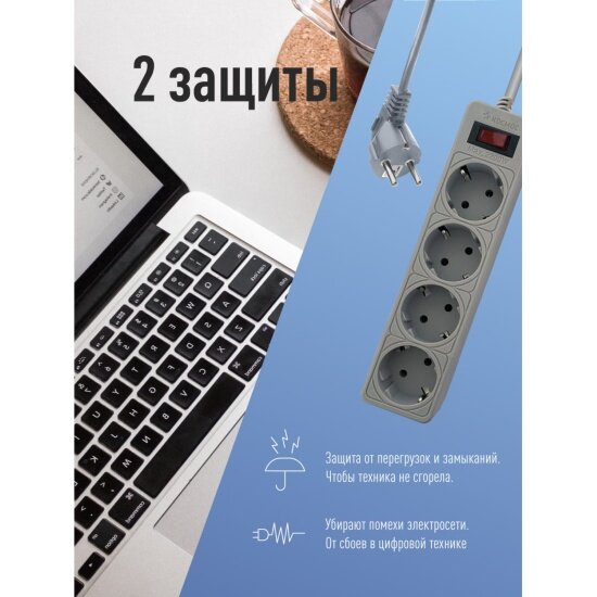 Сетевой фильтр Космос 1,5м, 4 гнезда, пвс 3x0,75мм2, серый FKsm1.5m-4g(G)